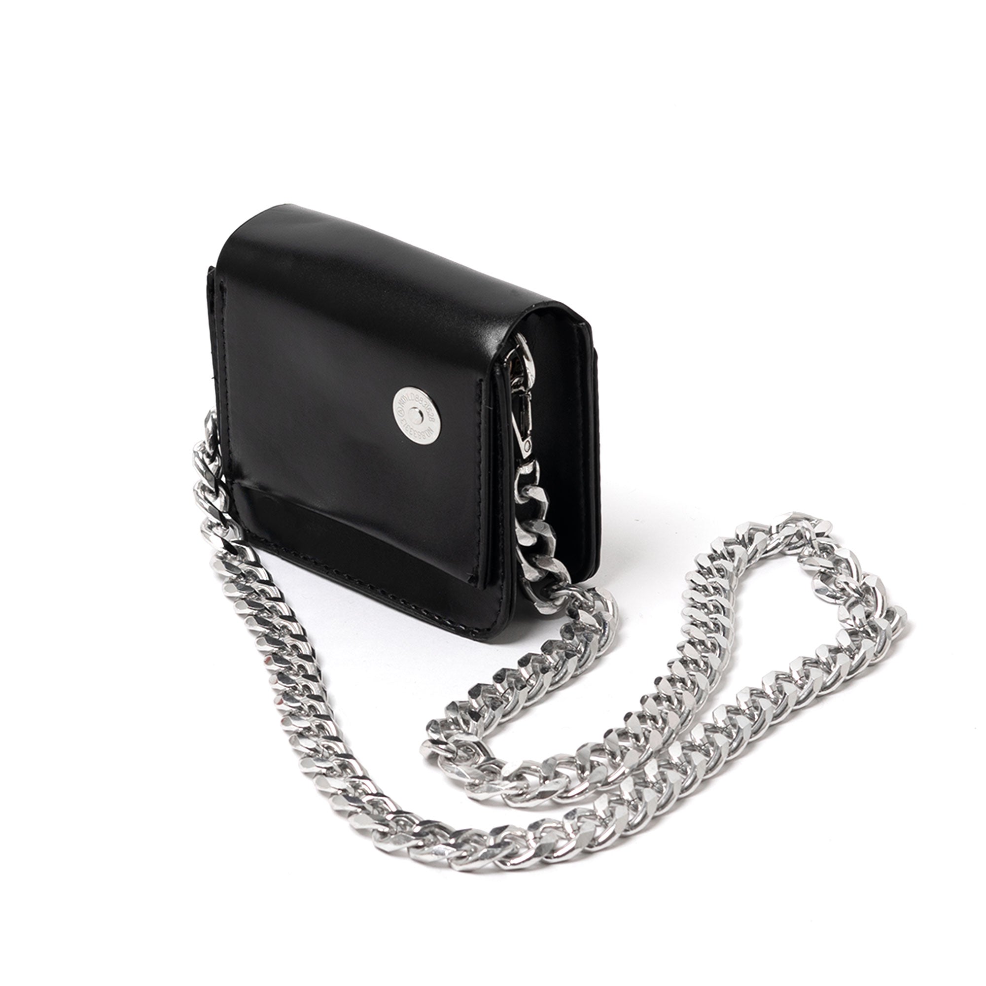 小さなフォルムでモードな印象を与えるチェーンミニポシェットは長めのチェーンに可愛らしいテイストで仕上げています。